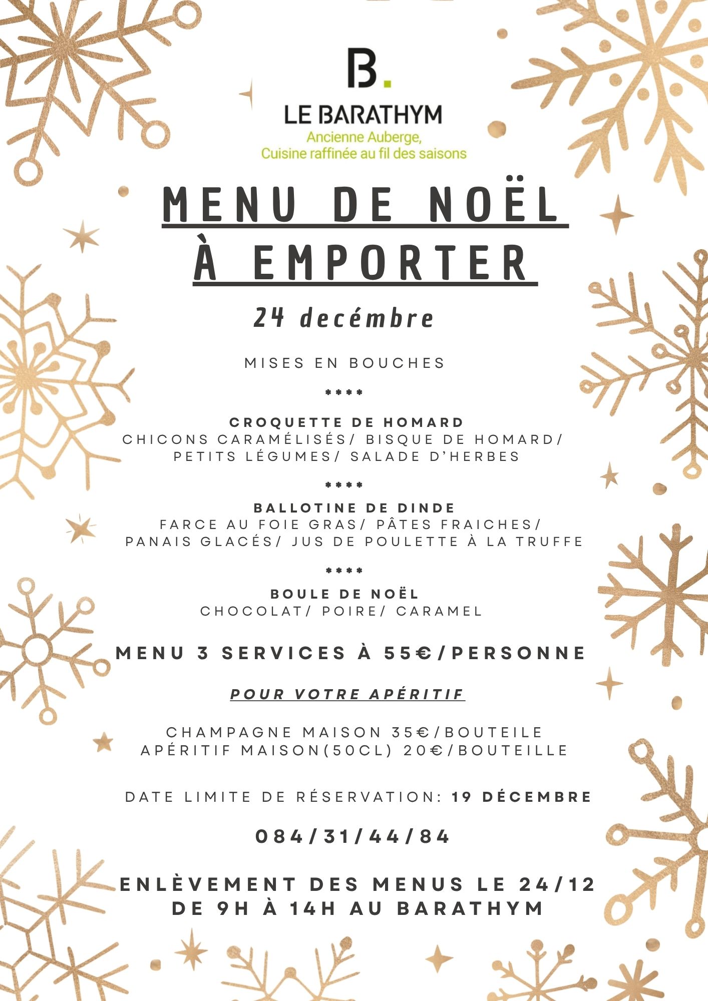 Le Barathym vous propose son Menu de Noël à emporter.